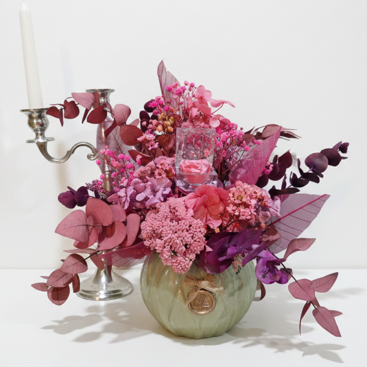 Cada detalle de este centro ha sido cuidadosamente diseñado para transmitir emoción y belleza. La composición presenta una exquisita combinación de flores preservadas y secas de primera calidad, seleccionadas en una paleta vibrante de rosas, fucsias, lilas y burdeos, que evocan pasión, ternura y armonía.