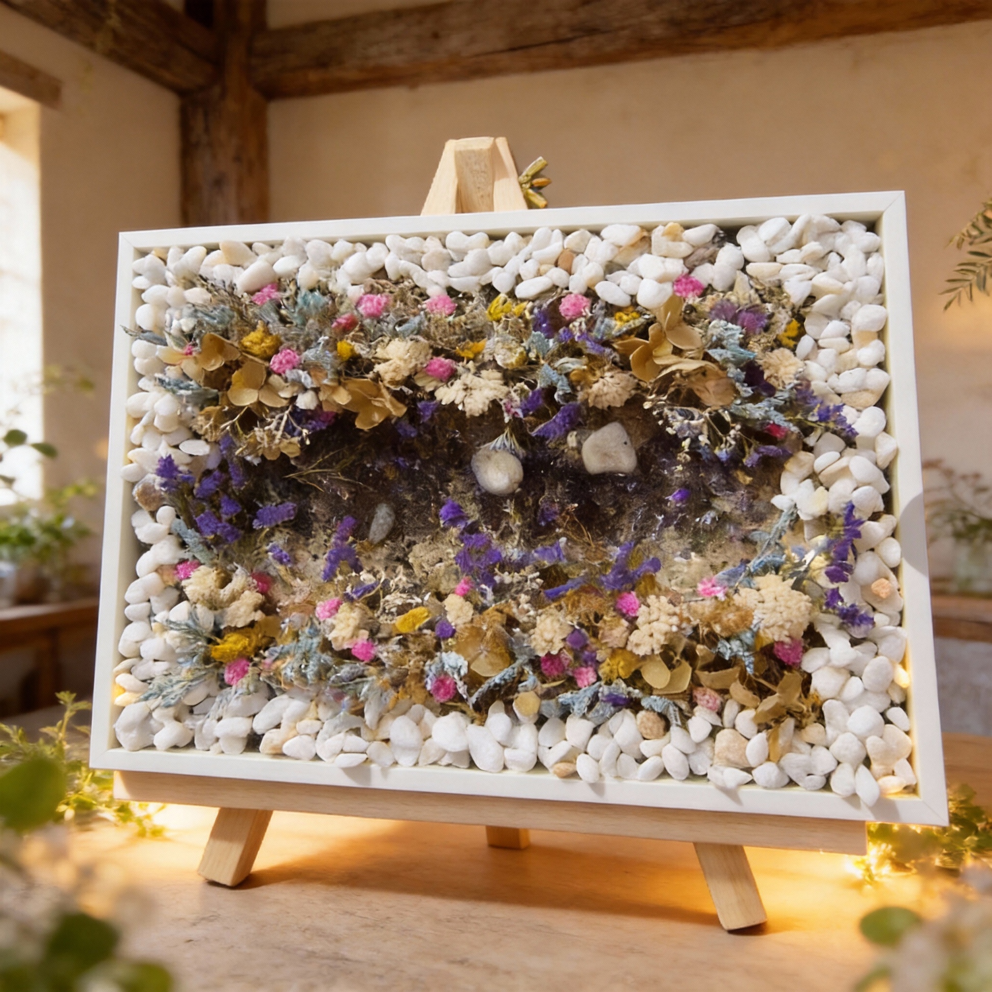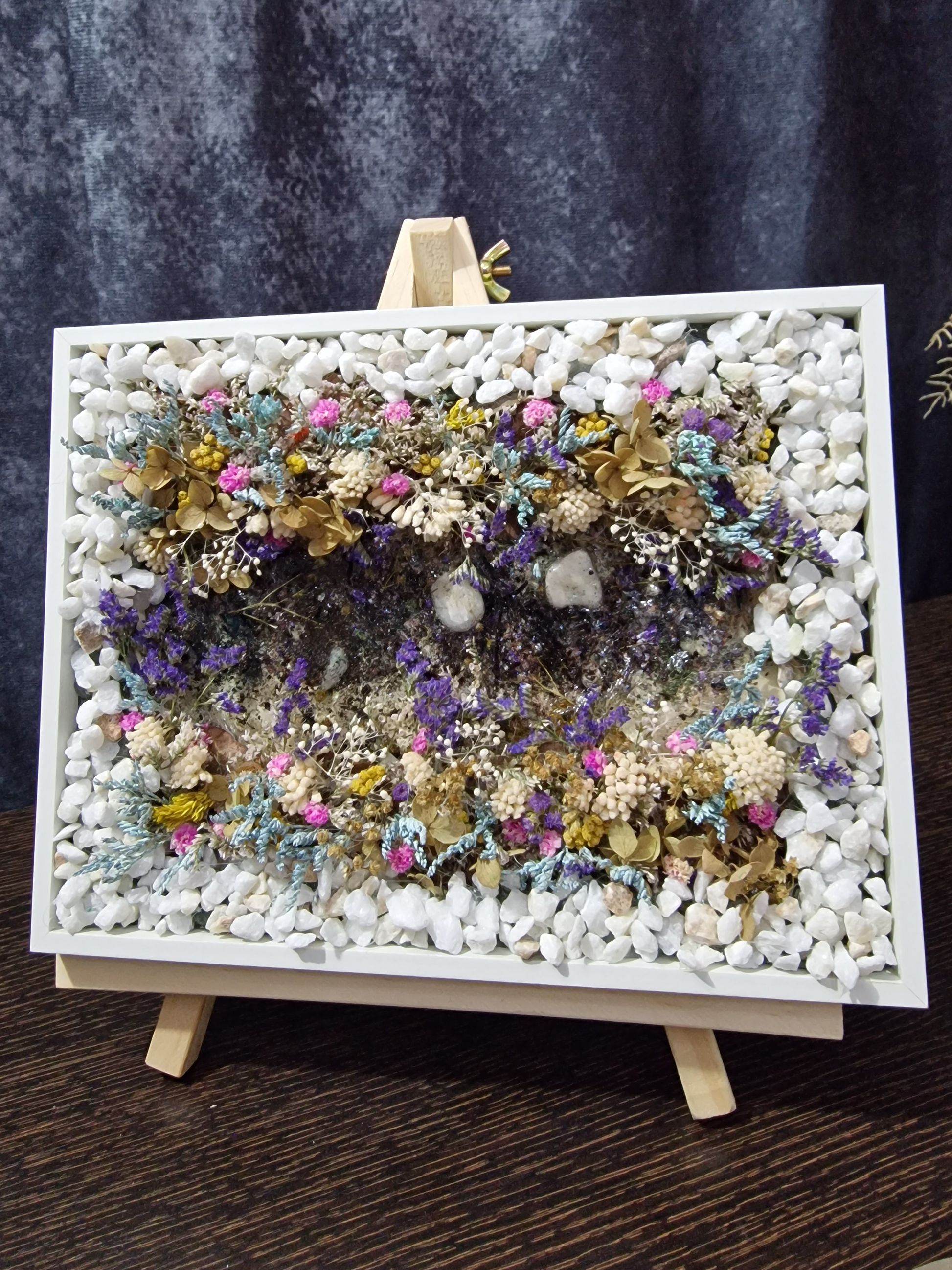 Este cuadro combina una exquisita selección de flores secas y preservadas en tonos lavanda, marfil, verde olivo, rosa y dorado, cuidadosamente integradas sobre una base de piedras blancas naturales que realzan su pureza y luminosidad.